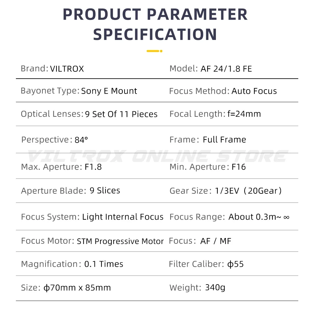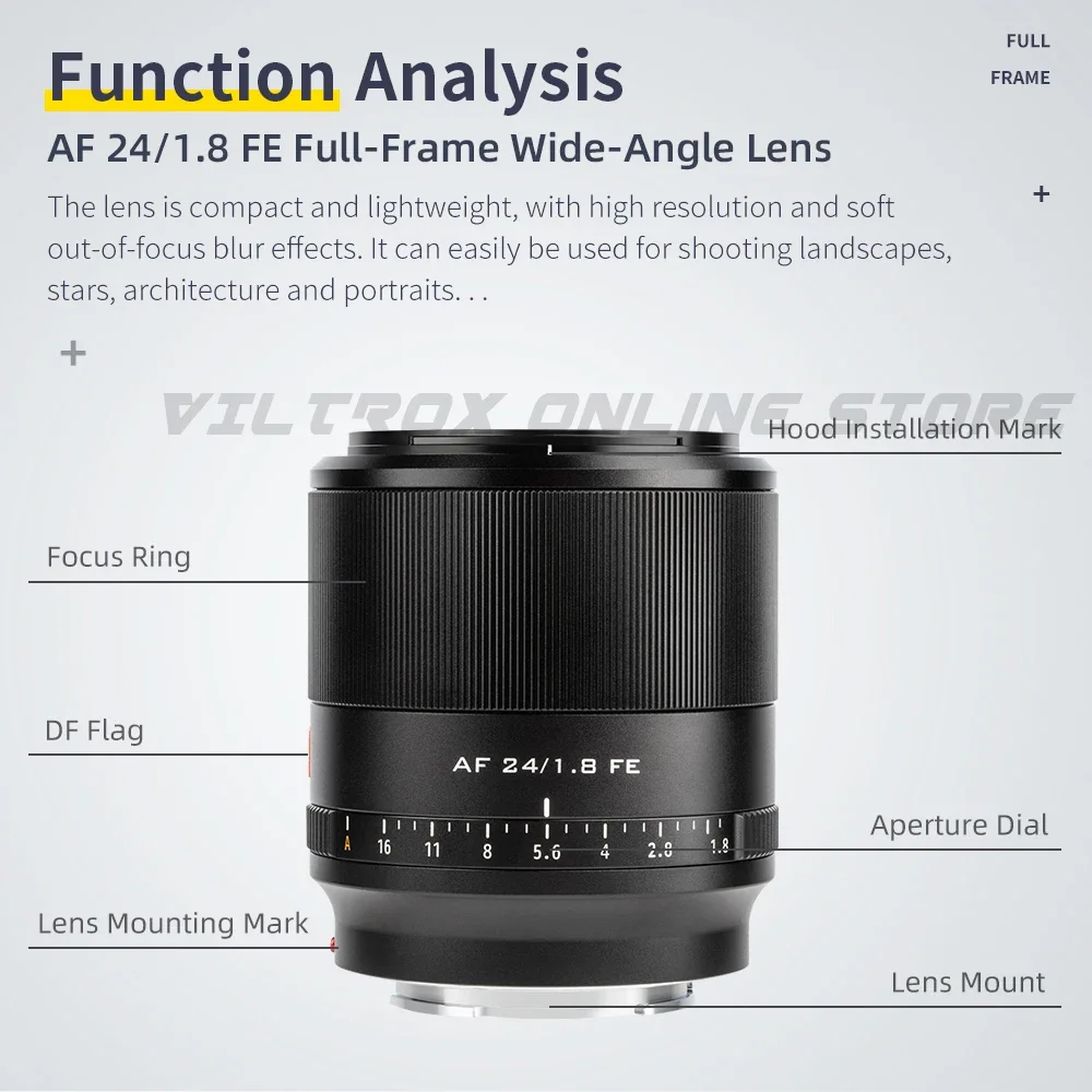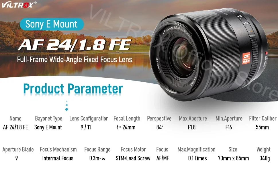 VILTROX AF 24mm F1.8 E Auto Focus prime lens is a full frame large aperture lens designed for Sony E-mount camera.